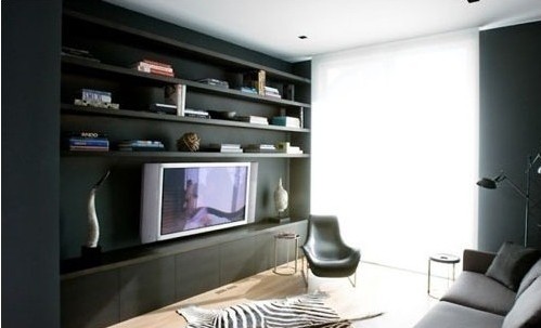 客廳電視背景墻:以倒梯形形式,設(shè)計(jì)背景墻擱板,梯形頂端空缺位置嵌入電視,擱板上放書、裝飾品等,這樣的長形擱板,選擇幾款合適的書擋,尤為重要。