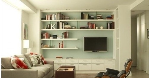 客廳電視背景墻:將收納功能融入背景墻設(shè)計(jì)元素之中,四個(gè)掛壁式書架整齊排列與電視兩旁,滿滿的放入書籍,各式書籍其實(shí)本身含有豐富的顏色、與文字,化作電視背景墻也別有一番味道。
