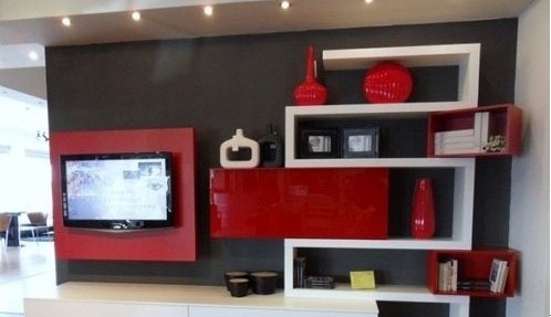 客廳電視背景墻:電視后背位紅色板,內(nèi)側(cè)的展示架造型宛如積木層層疊起,制造出完美的視覺效果,是家中收藏品與裝飾品的良好收留所。