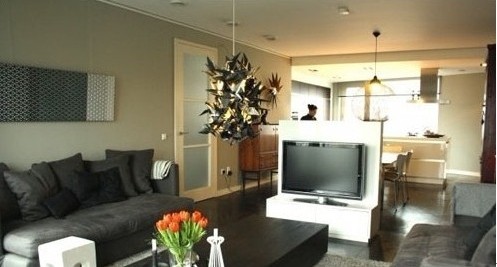 客廳電視背景墻:不被常規(guī)思維所固定,電視不一定僅擺放在墻面上,像這樣的,設(shè)計(jì)有電視靠板的電視,巧妙的放于客廳中央,不僅節(jié)約空間,還成為了客廳與餐廳的隔斷。