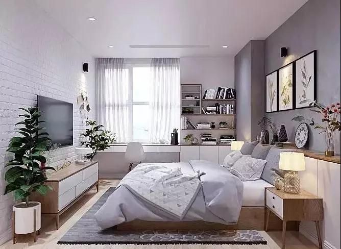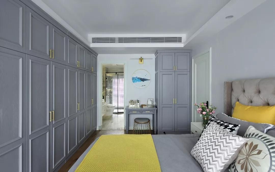 如果進(jìn)門(mén)處有衛(wèi)生間或是衣帽間,面積寬裕的臥室可以將中央空調(diào)的吊頂和衣柜一起設(shè)計(jì),更加合理的利用起空間。