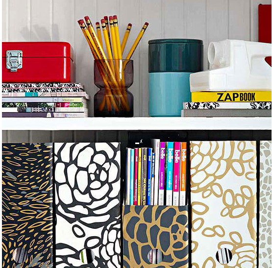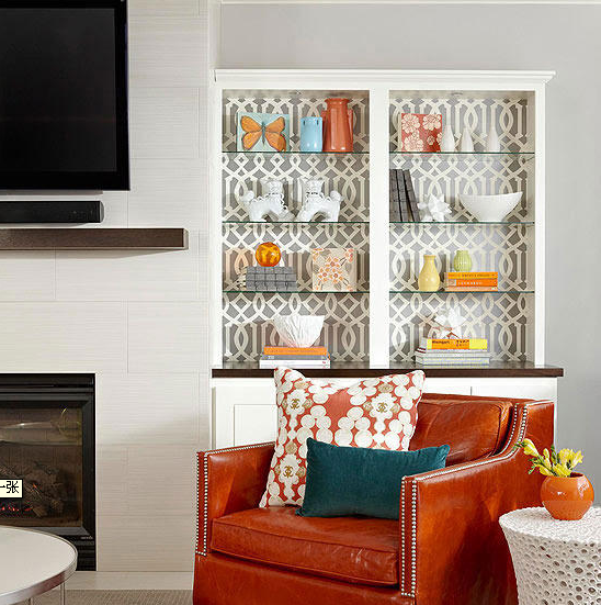 壁紙、織物等裝飾時余留下的,扔掉太可惜了,裝起來!用作書柜或者展示柜的打底,不同花紋的內襯,也會讓人眼前一亮。