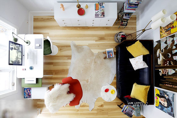 以不同的視覺俯瞰我們常年居住的空間,會獲得另外一種視覺感受。方形空間,沙發(fā)、邊柜、書桌都有序擺放,有緊有散,不會產(chǎn)生壓抑感。大大的玻璃窗讓陽光投射進來,白色為基礎的空間更為膨脹,清爽木色融入,點燃空間明媚氣氛。