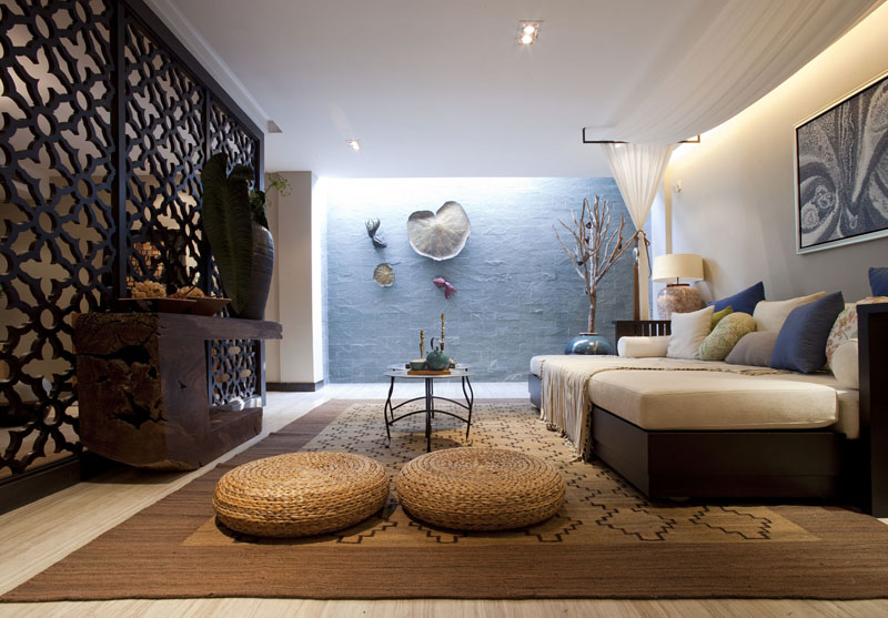 東南亞風(fēng)格的裝飾中,室內(nèi)所用的材料多直接取自自然。由于炎熱、潮濕的氣候帶來(lái)豐富的植物資源;木材、藤、竹成為室內(nèi)裝飾首選。